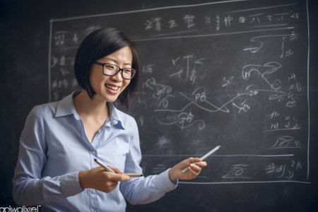 An Asian female teacher in a classroom near the whiteboard is writing and teaching a lesson with a special lecture in a class column. Math teacher explains arithmetic sums to university students.