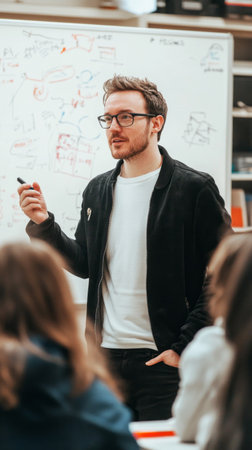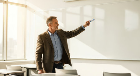 Teacher explaining a concept on a whiteboard in a classroom, bright natural light, engaged mood. Man interacting with students, blurred background. Generative AI
