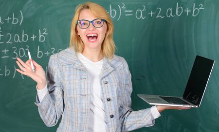 Woman teacher wear eyeglasses holds laptop surfing internet. Digital technologies concept. Educator cheerful lady with modern laptop surfing internet chalkboard background. Education is fun