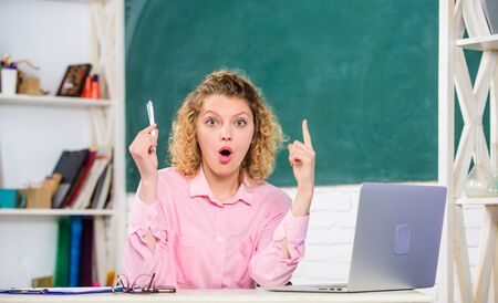 Online courses for adult. Teacher in classroom work with notebook. Pass test online. Online video lesson. Woman student studying with laptop. Educative webinar. School knowledge. Distance learning