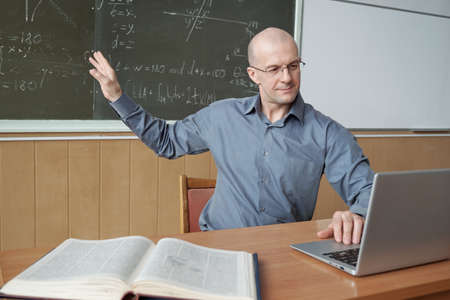 Aged man college professor sit at desk in classroom in front of chalkboard explains lesson using laptop online video call with students. Education concept.