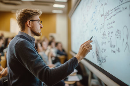 A knowledgeable instructor engages students by explaining intricate ideas in a classroom. The atmosphere is focused, with equations illustrated on chalkboards behind him.