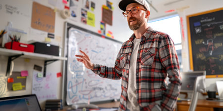 Science teacher of middle age standing in front of the whiteboard in a classroom, guiding students through scientific principles. The teacher professional approach ensures an effective learning environment.