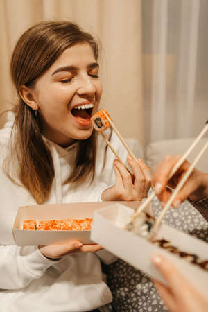 Blonde girl in a white sweater eats chinese sushi rolls at home. High quality photo