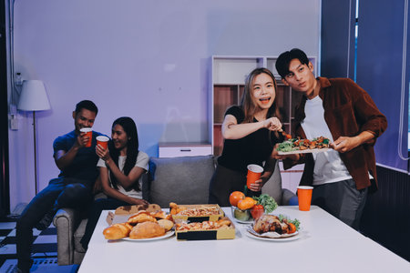 Happy young friends group having lunch at home. Asia family party eating pizza food and laughing enjoying meal while sitting at dining table together at house. Celebration holiday and togetherness.