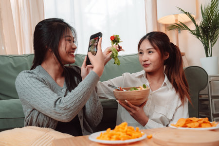 Two young women enjoy eating healthy food, friends share happy moment in living room, girl photographs fresh salad with smartphone, capturing memories for social media, relaxing in comfort of home.