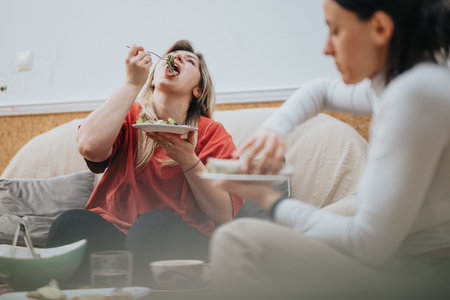 Two female friends enjoying a casual meal together at home