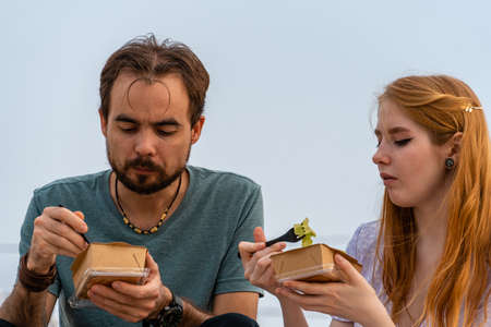 Focused young couple eating takeaway food while sitting in street