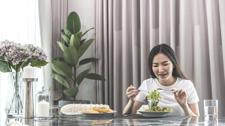Asian woman eating salad on the dining table smiling and happy, Vegetable salads are rich in vitamins and minerals, Fat-low-calorie and high-fiber diets, Health care by eating fresh vegetables.
