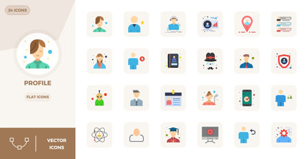 Thoughtfully designed 24 vector icons themed around Profile, crafted in Flat with 128x128 PIXEL perfect precision for contemporary design needs.