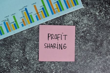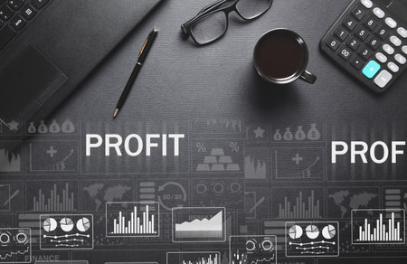 The word PROFIT made with wooden cubes on table with different color graphs and diagram in light room