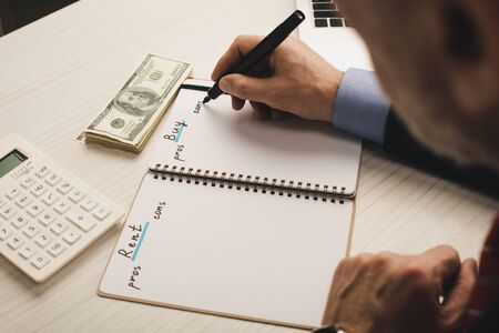 selective focus of agent writing in notebook with rent and buy lettering near money and calculator