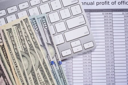 Money cash banknotes calculations and computer keyboard on table