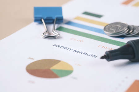 Selective focus of coins, pen and board written with PROFIT GROWTH.