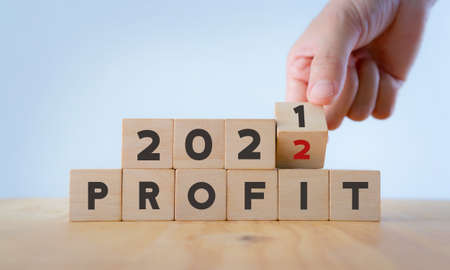 Business profit plan concept in 2022 . Build a profit and financial plan. Hand flip wooden cubes 2021 to 2022 with text PROFIT on white background and copy space. Business performance target in 2022