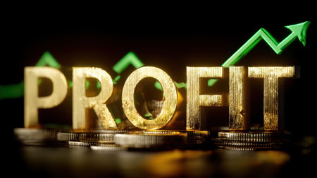 Gold coins stacked on soil with upward arrow symbolizing financial growth and investment success, reflecting prosperity and economic progress