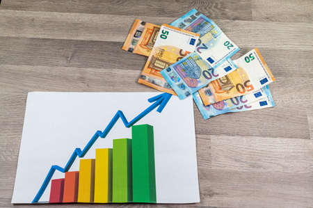 Graphic with ascending line on paper note, dollar coins and banknotes - Concept of increasing money value