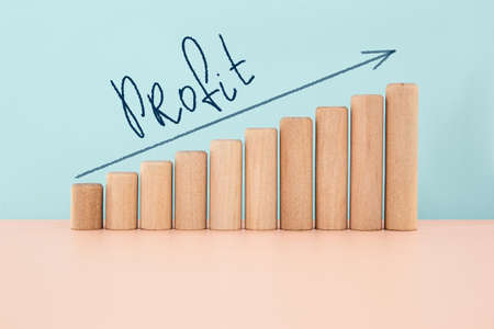 Profitability Concept for Business and Financial Growth. The grip of the wooden cube with the arrow icon is steadily increasing.