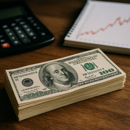 Business woman gripping The United States hundred-dollar bills in her hand and some put on the table full with business charts and notebook