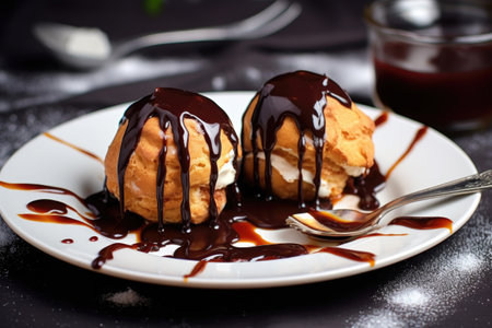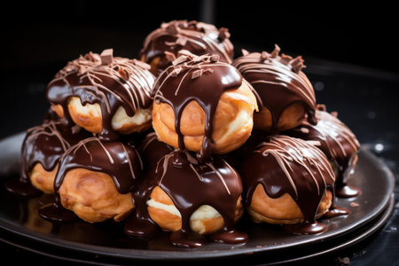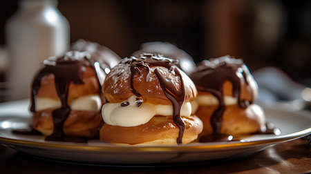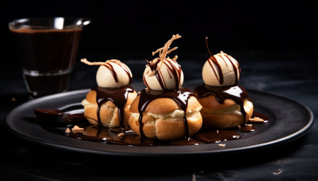 AI Generated. A plate of profiteroles filled with vanilla custard and drizzled with chocolate sauce