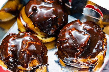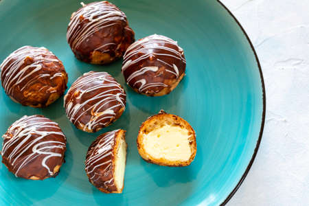 the chocolate covered vanilla cream pastry puffs closeup.