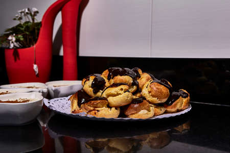 Rich Profiteroles chocolate. Sauce cooking cream. Generate Ai