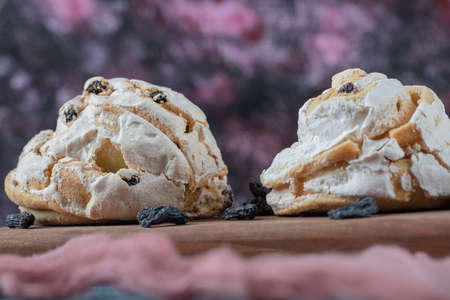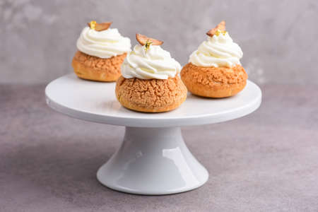 Cream puff pastry with cream on a wooden plate. Close-up.
