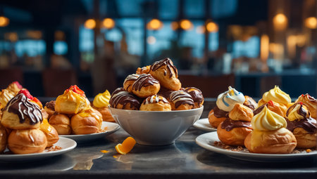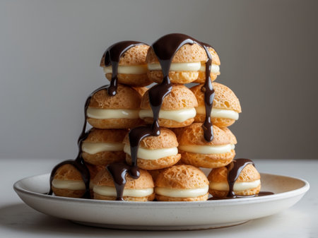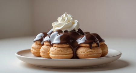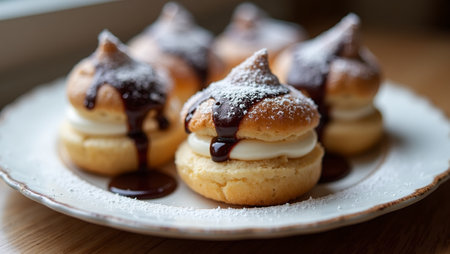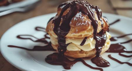 Decadent profiteroles filled with cream and topped with chocolate sauce, elegant presentation, soft lighting