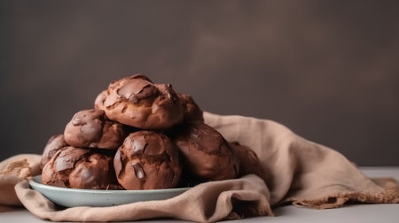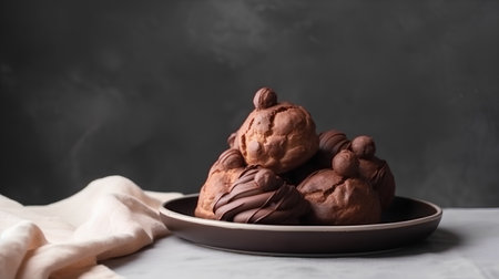 Velvety Profiteroles chocolate. Sauce cooking cream. Generate Ai