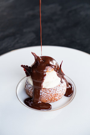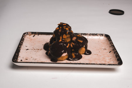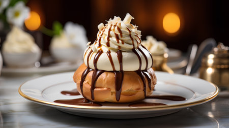 AI Generated. A decadent profiterole with vanilla cream filling and a rich chocolate sauce