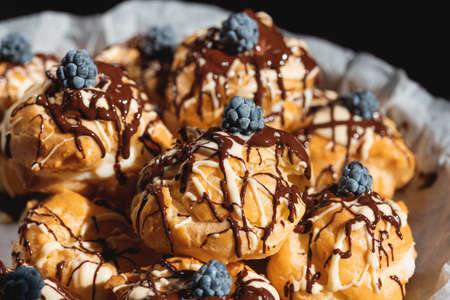 Closeup of homemade profiteroles with custard cream decorated with dark and white melted chocolate, blackberries in wicker basket. Selective focus