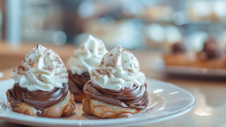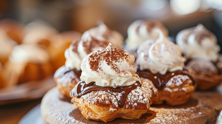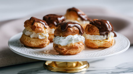 This enticing image showcases beautifully crafted cream puffs filled with whipped cream and topped with rich chocolate. Perfect for any celebration.