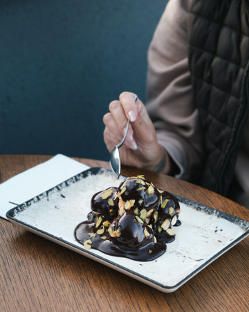 Woman eating ice cream with chocolate sauce and nuts on wooden table.