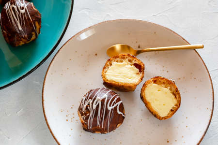 Cream puffs or eclair or choux cream with vanilla custard on wooden table on white plate put on wood table, eat to tea and coffee with cocoa cold, copy space
