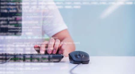 Programmer working on laptop in a software develop company office. Programmer typing code on computer.