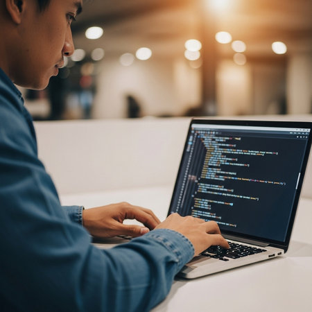 software developer writing programming code on laptop computer