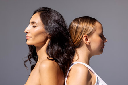 Beauty portrait of two attractive young women with clean healthy skin and hair. Charming models with natural makeup on a gray isolated background. Cosmetology and spa treatments. Skin care concept.