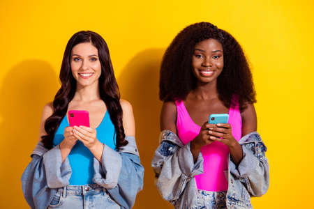 Photo of optimistic nice brunette hairdo ladies hold telephones wear bright tops jeans shirts isolated on yellow color background