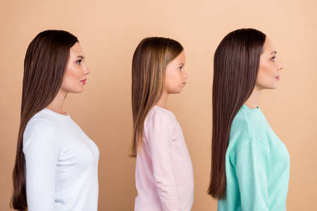 Profile side photo of calm family generation woman look empty space isolated on pastel beige color background