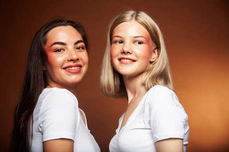 two pretty diverse girls happy posing together: blond and brunette, caucasian and asian on brown background, lifestyle people concept