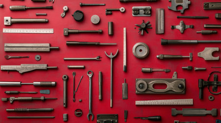 This image features an arranged collection of vintage hand tools on a vibrant red background, showcasing a variety of equipment for repair and crafting.