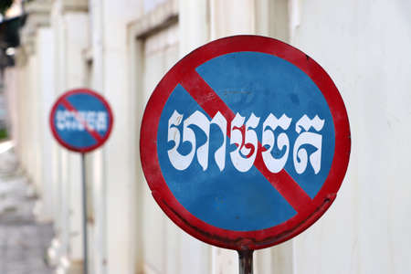 Traffic Signs on the road beside the wall, no-parking sign in Cambodian language.