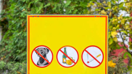 Three prohibiting red signs on a yellow background. No dog, no smoking, no drinks signs. Forbidden concepts.