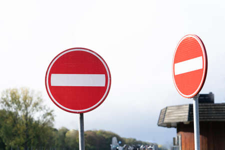 Two red circular traffic signs or roadsign with white bar indicating no entry on a gray metal post against a cloudy sky in a forest area