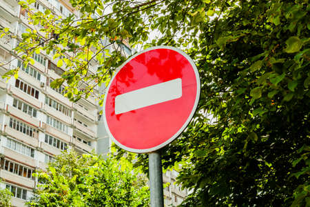 A striking red circular prohibition sign displays a white horizontal bar, set against a blurred city backdrop. This image highlights themes of urban restrictions and safety.