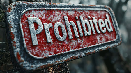 A close-up of a weathered 'Prohibited' sign covered in frost, conveying strict restrictions and cold ambiance in a natural setting.