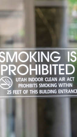 Vertical frame Smoking is Prohibited sign close up on clear glass door of building in Utah. Blurry view of other buildings and lush green trees can be seen in the background.