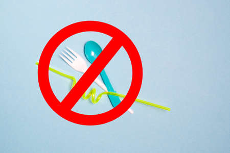 disposable plastic cutlery crossed out with stop sign of carcass color, blue background, top view, copy space, nature pollution concept