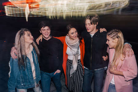 Friends night party. Blurred background. City movement. Happy students outdoors, strong friendship