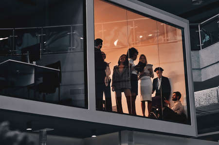 Teamwork. Behind the glass in the meeting room in a spacious large business center, a team of young people stand and discuss the work.